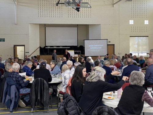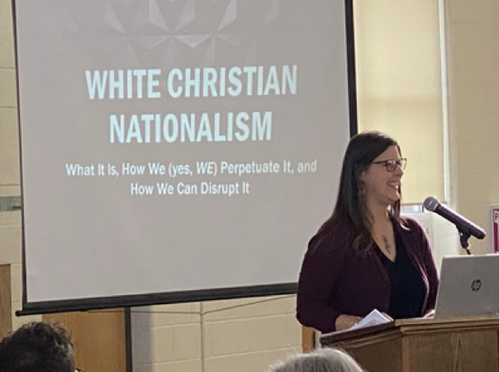 The rise of White Christian Nationalism has been front and center in the news, and on January 18, AUMC hosted a presentation by Dr. Rebecca David Hensley on the topic that attracted 130 people. Participants discussed the definition of White Christian Nationalism, learned about how concepts such as Manifest Destiny and the Doctrine of Destiny perpetuated its ideals throughout the history of our country, and how research shows that people supporting White Christian Nationalism tend to prioritize order and freedom for themselves and may use hierarchy and violence to protect those values.